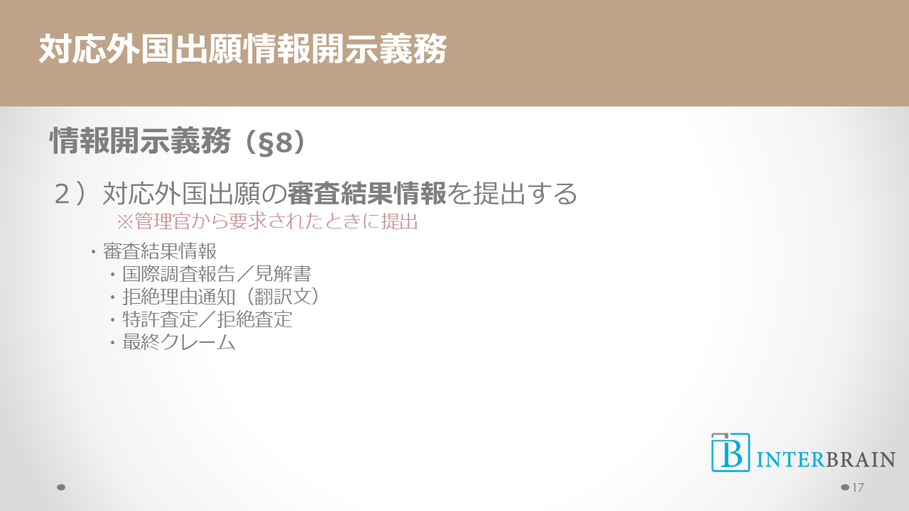対応外国出願(ファミリー出願)に関して情報開示の義務があります。