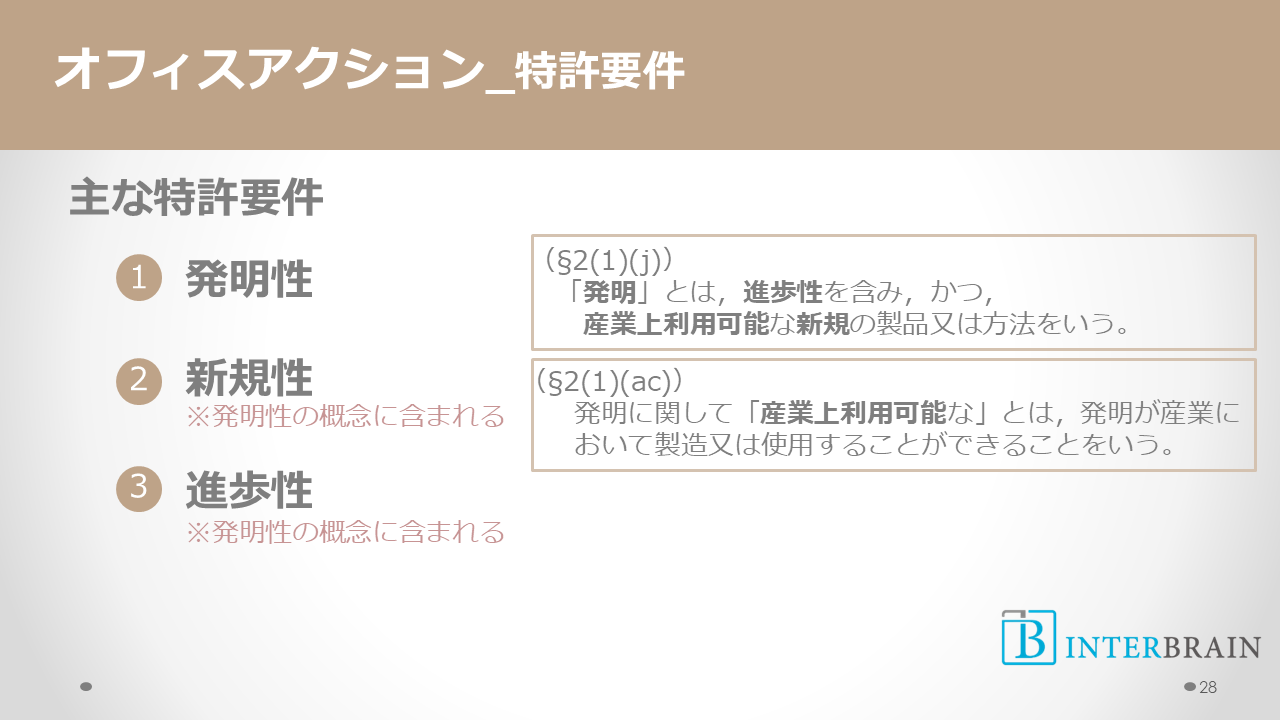 主な特許要件はこのとおり。それ以外に記載要件(明確性)などもあります。