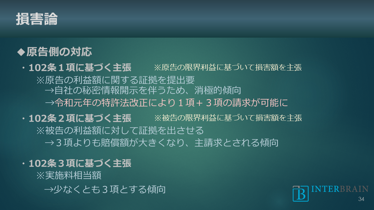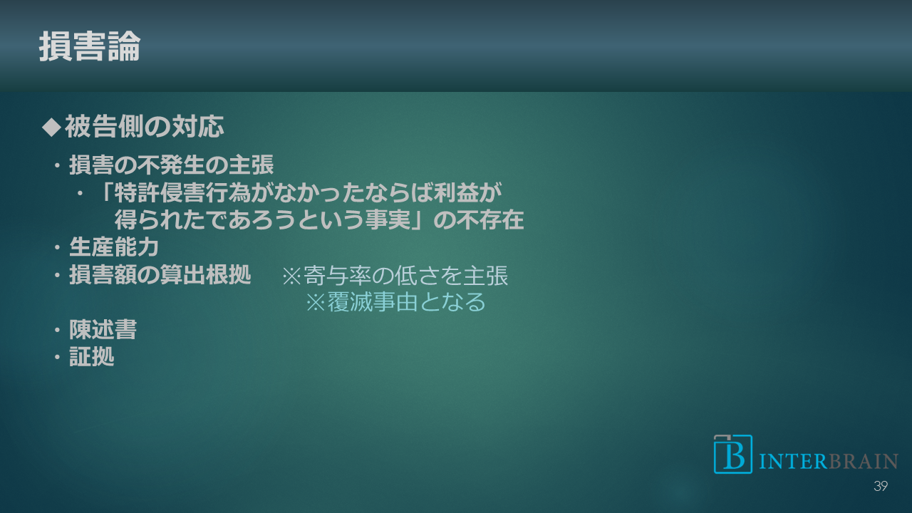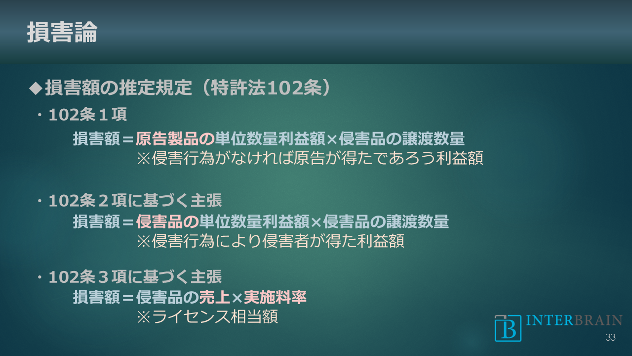 損害額の推定規定があり(特許法102条)、これに基づくお互いの主張・立証がなされます。