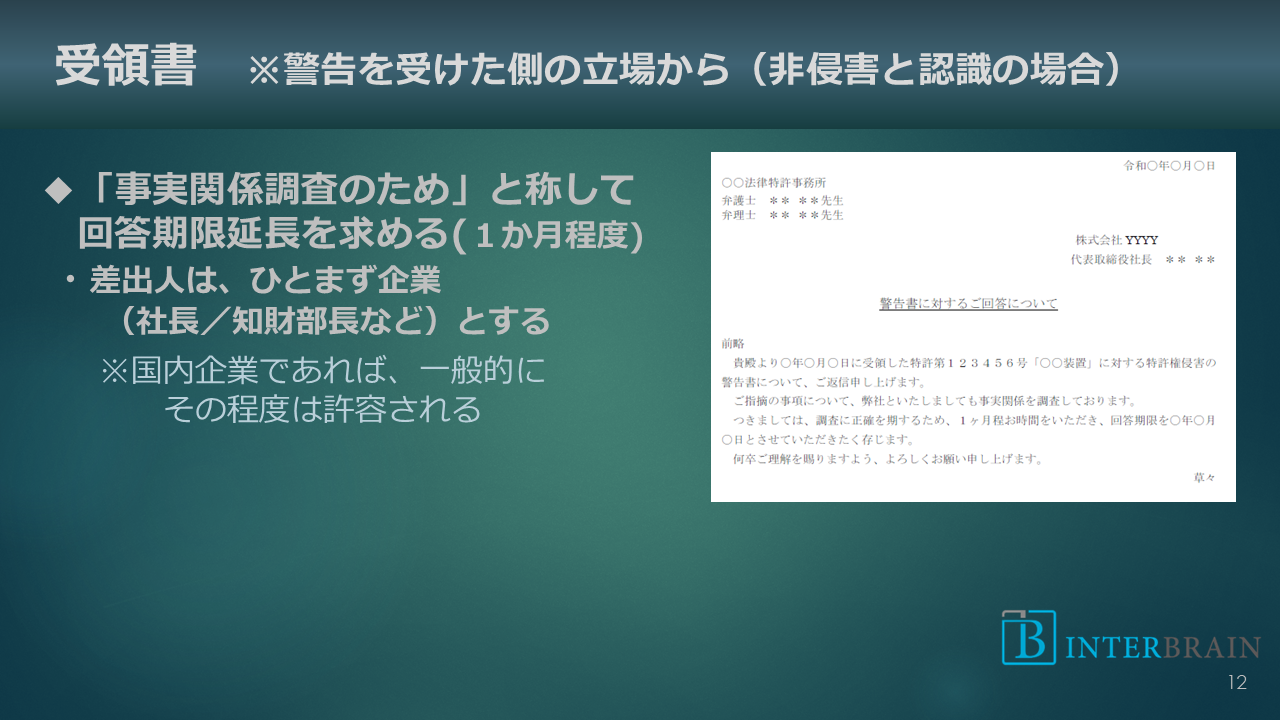 場合によっては差出人を代理人(弁護士/弁理士)とし、専門的見地からの回答であることを示します。
