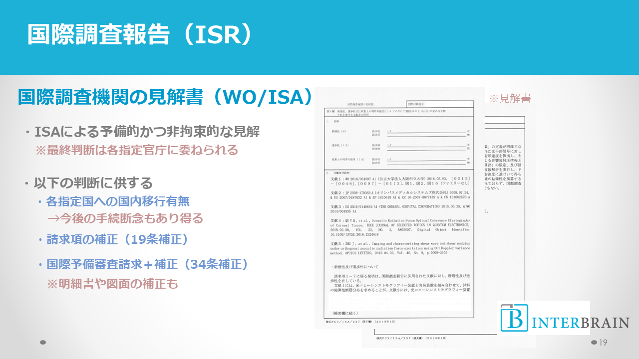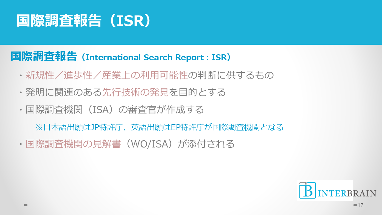 国際調査見解書(WO/ISR)として審査官の見解が示されます。