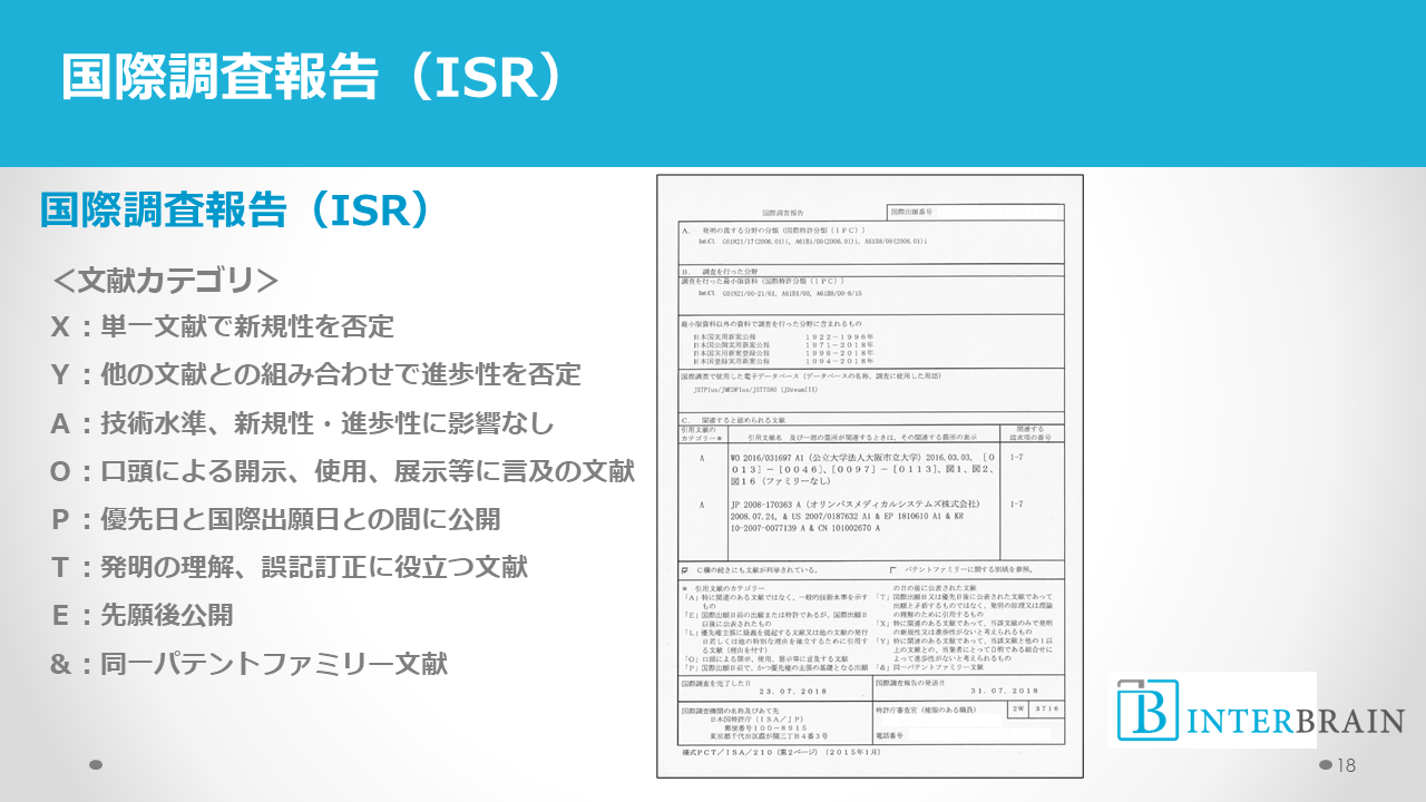 国際調査報告(ISR)として、関連技術が記載された公知文献(引例)がリストアップされます。