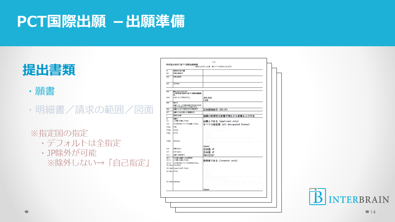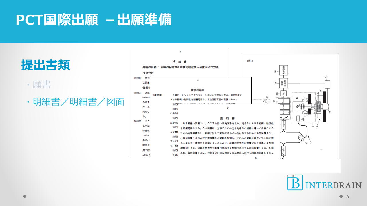 PCTフォーマットがあるので、それに合わせて願書や明細書等を作成します。