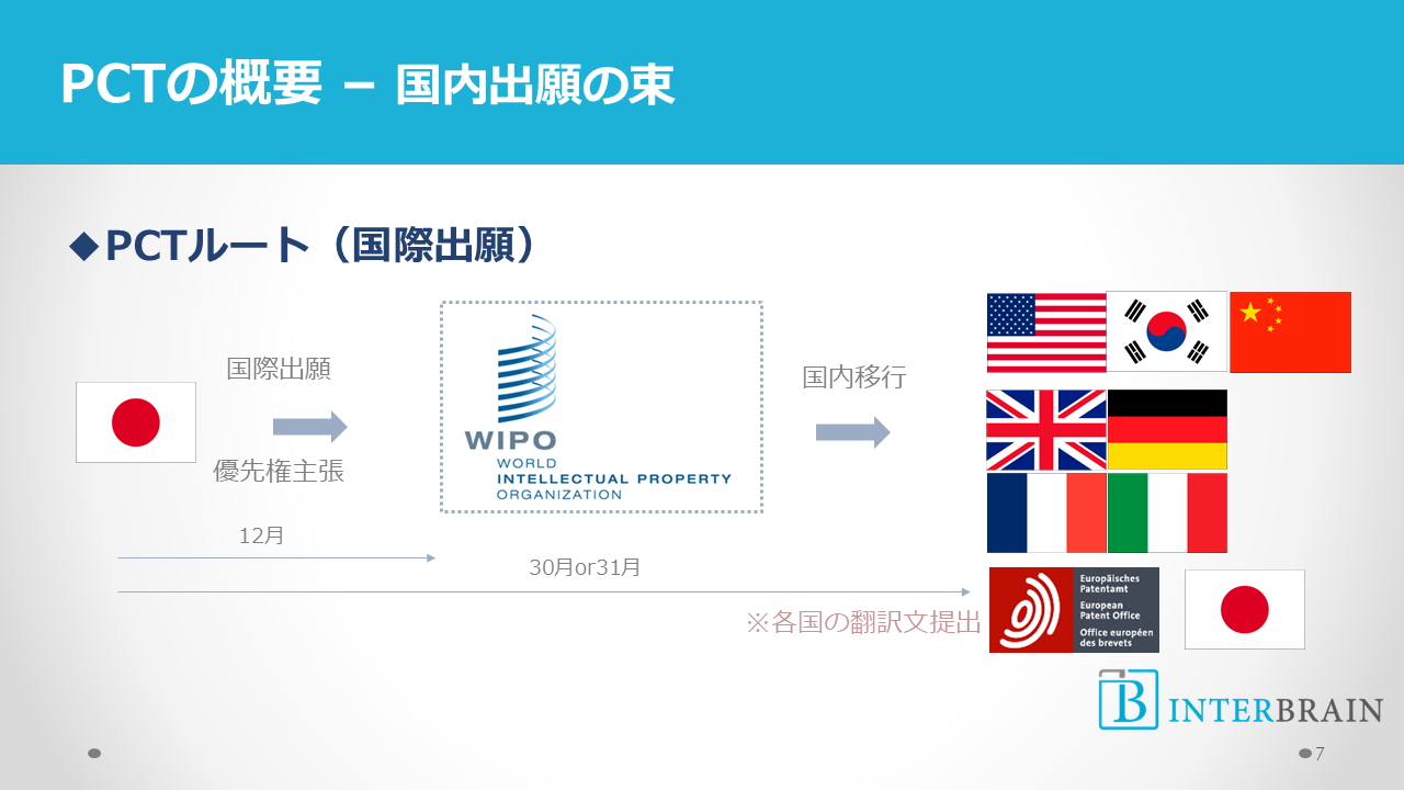PCTルートを選択する場合、国際出願(PCT出願)をした後、優先日から30月又は31月以内に各国(指定国)に移行させます。その際に翻訳文を提出します。