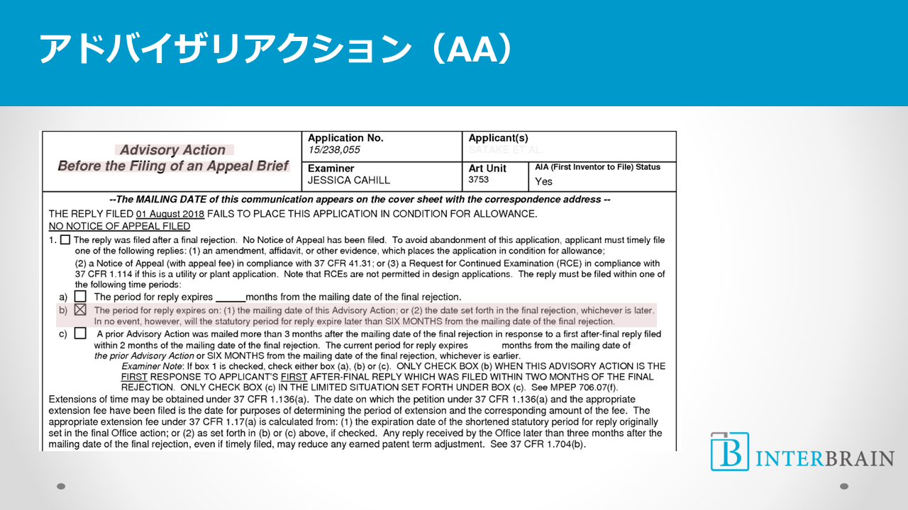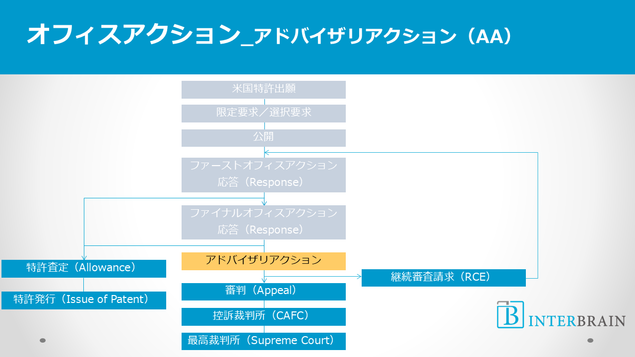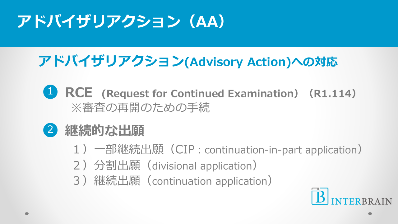 アドバイザリアクションに対してはRCE、継続的な出願、審判請求などの対応が可能です。