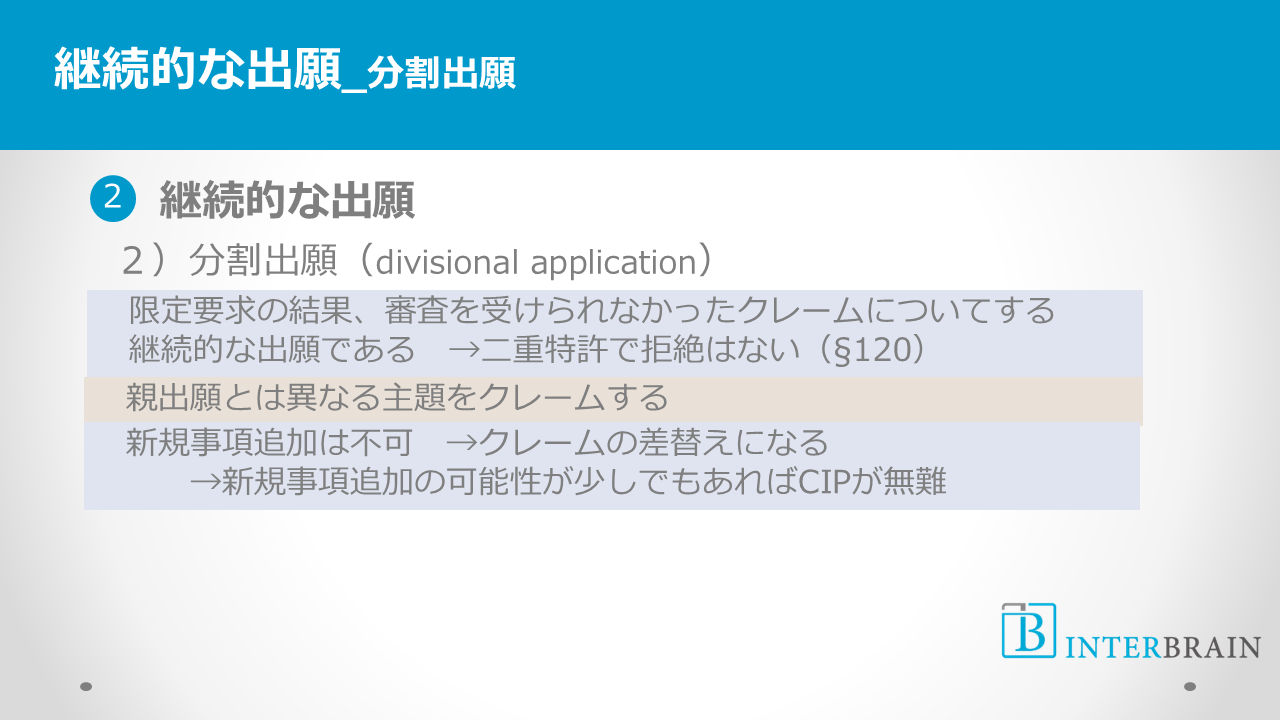 限定要求などで一部のクレームが審査されなかった場合、それらを分割して新たな出願をすることができます。