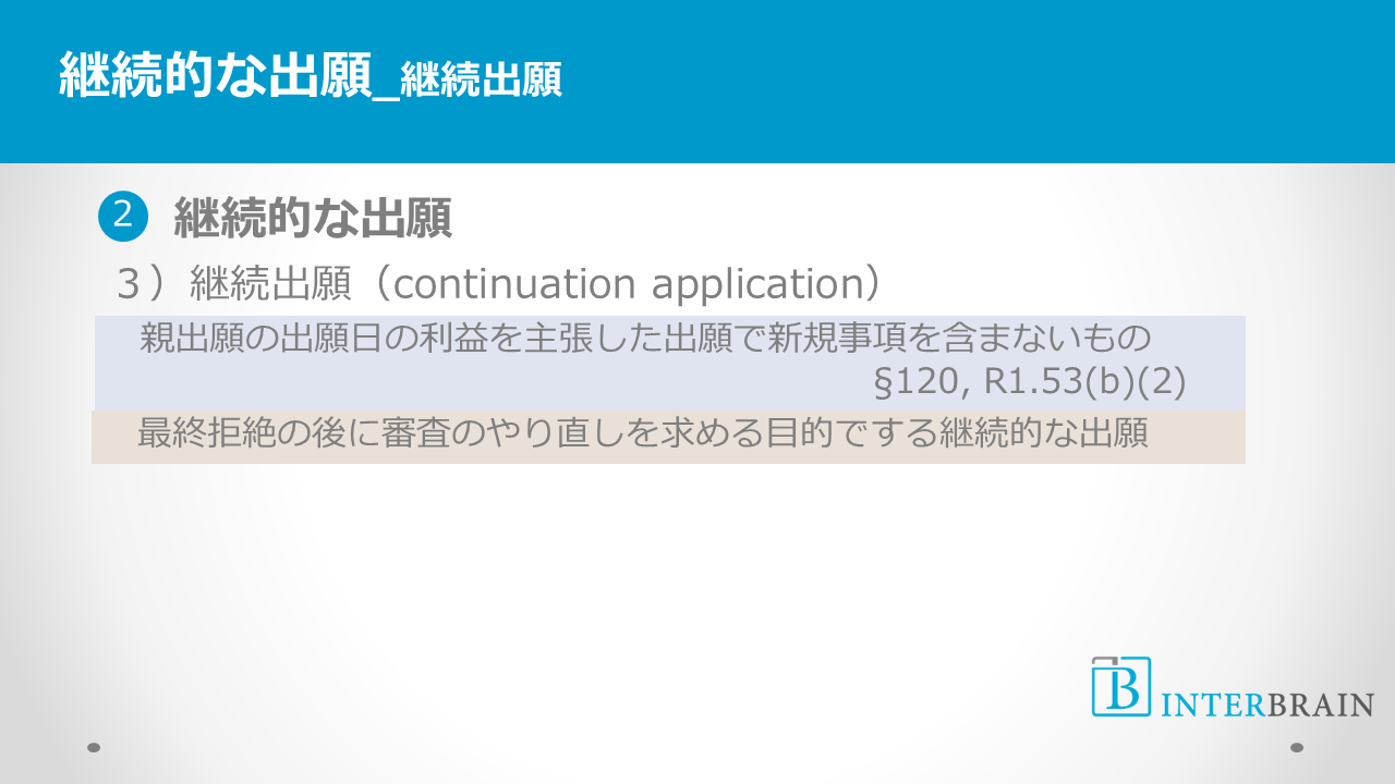 発明をシフトした別の権利を取得したい場合、継続出願を行います。