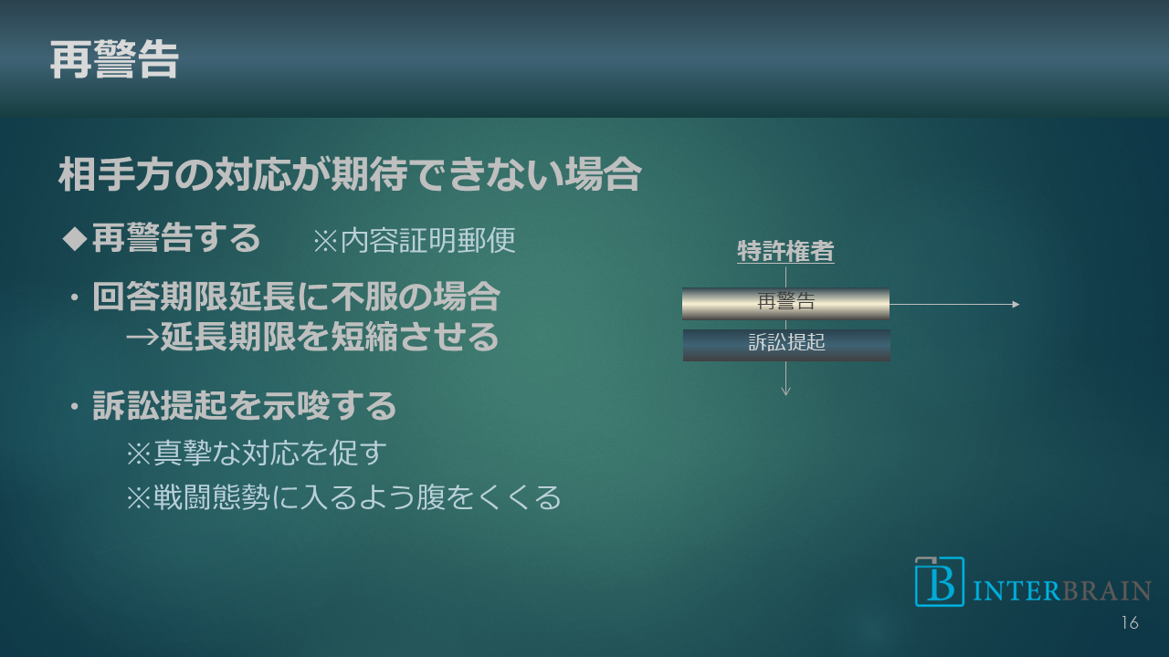被疑侵害者から度重なる期限延長がなされた場合、再警告をして延長期限を短縮させる、さらに訴訟提起を示唆するなどします。