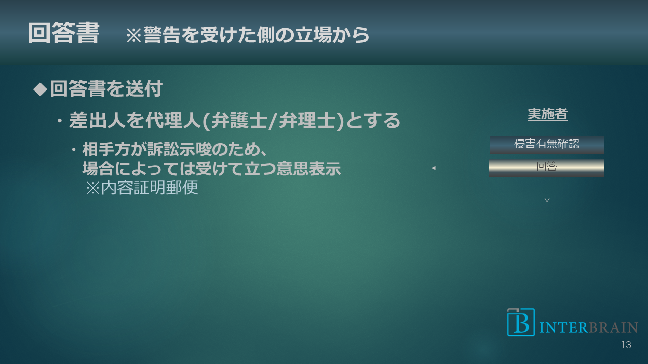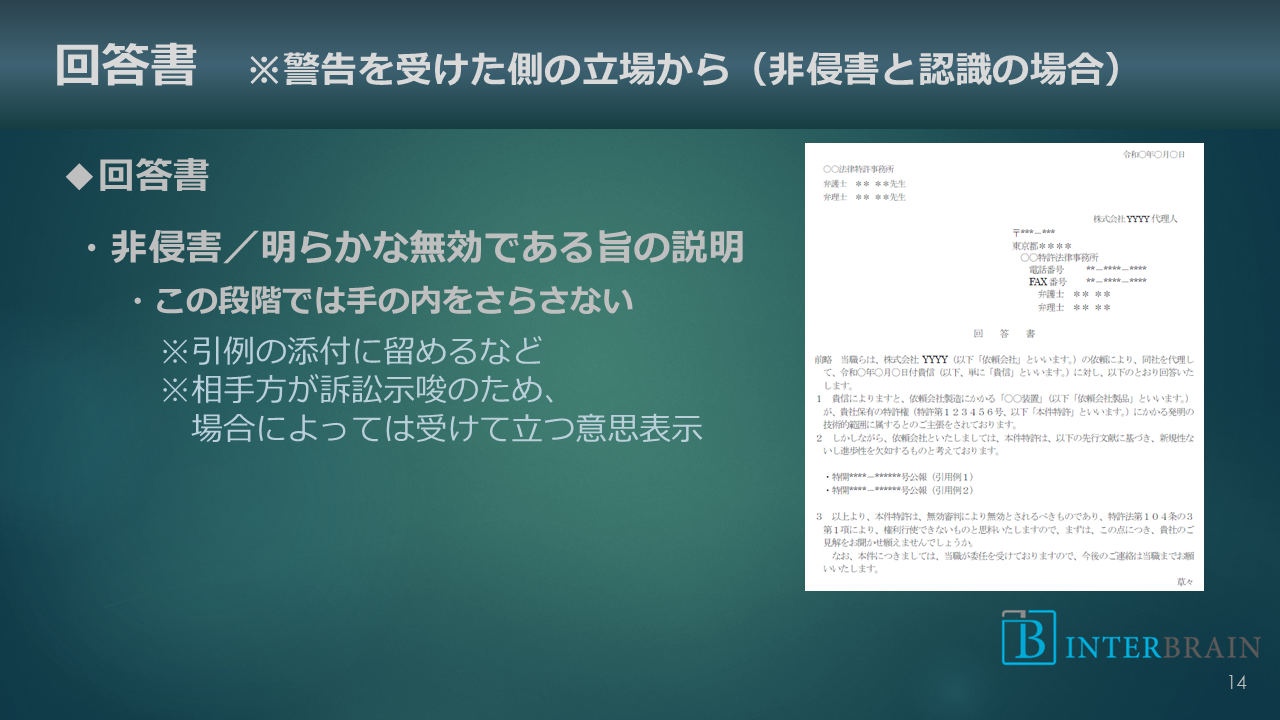 回答書の中では非侵害であること、あるいは特許が無効理由を有していることなどを説明します。