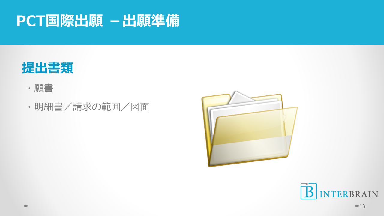 PCTフォーマットがあるので、それに合わせて願書や明細書等を作成します。