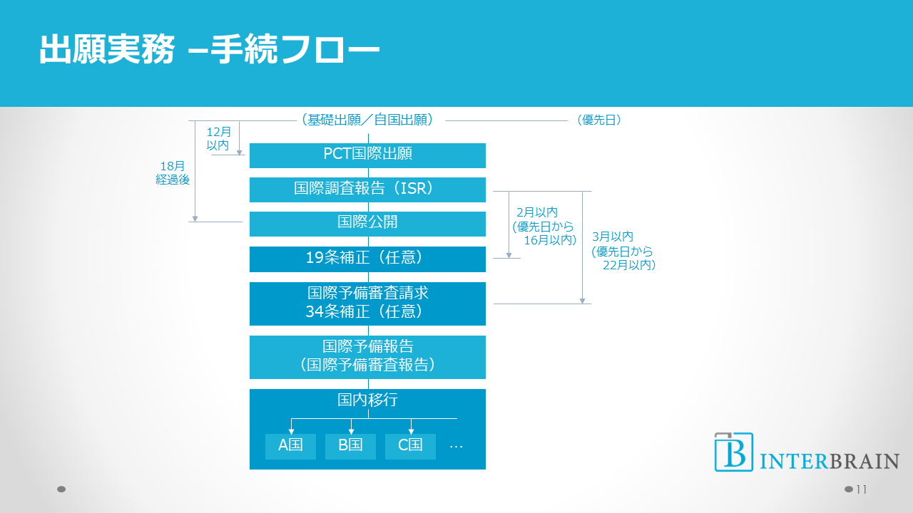 国際段階で特許性に関する調査結果が出されるので、この調査報告に基づいて各国への出願有無を検討します。