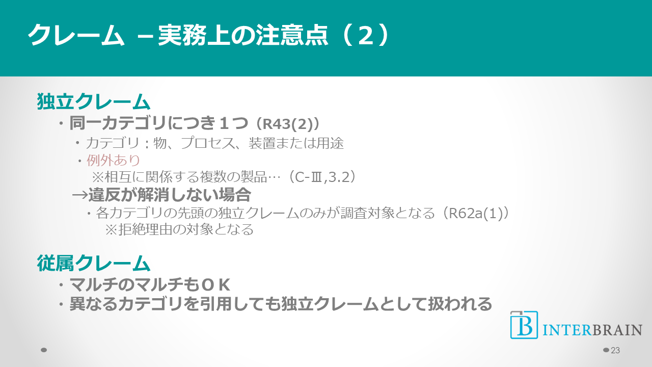 一部の例外を除き、同一のカテゴリについて2以上の独立クレームを含めることはできません。