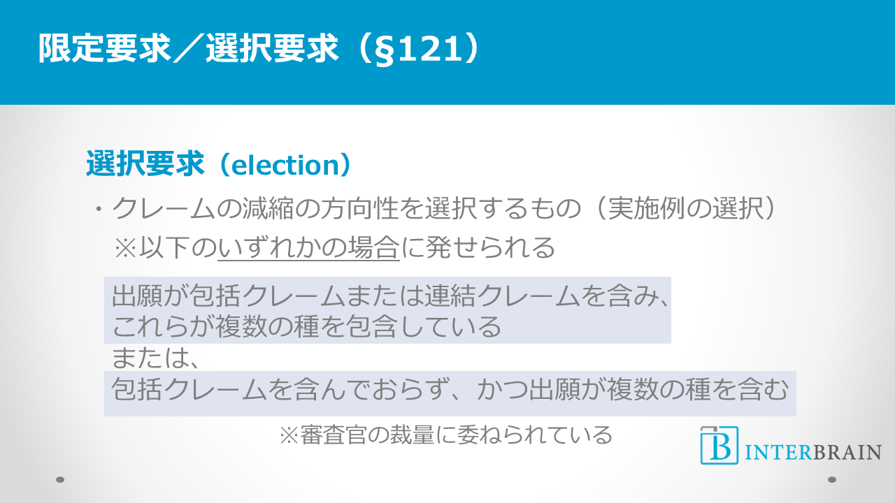 特許が受けられる場合、限定要求は撤回され、審査官による種クレームの再併合がなされます(MPEP821.04)。